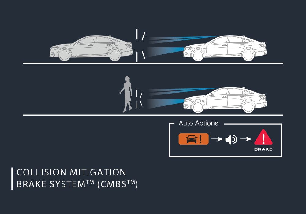 Collision Mitigation Braking System (CMBS™) membantu Anda ketika terdapat kemungkinan kendaraan berbenturan dengan kendaraan lain atau pejalan kaki yang terdeteksi di depan. CMBS™ didesain untuk dapat memberi tanda ketika potensi berbenturan dapat terjadi, yang membantu mengurangi kecepatan kendaraan untuk mengurangi dampak benturan yang tidak terhindarkan.