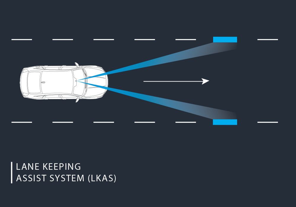 Lane Keeping Assist System (LKAS) membantu kemudi untuk menjaga kendaraan tetap berada pada jalur dengan mendeteksi marka jalan di kiri dan kanan mobil kemudian mengkoreksi setir jika mobil terdeteksi keluar dari jalur.
