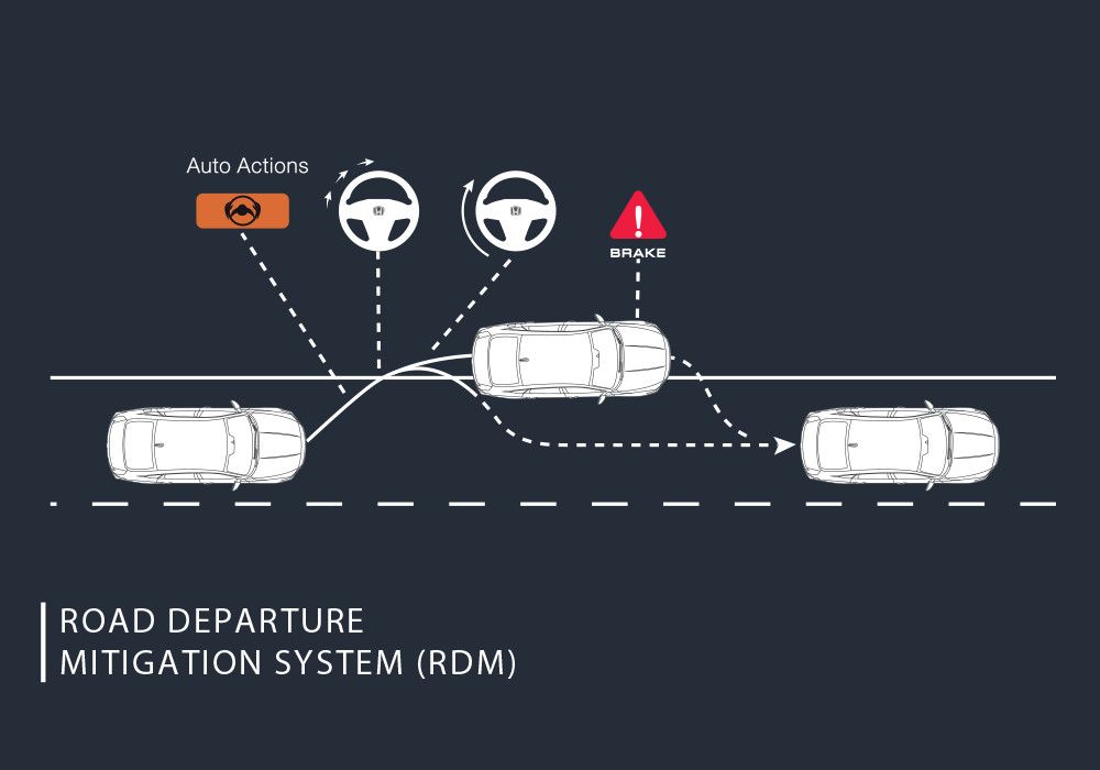 Road Departure Mitigation (RDM) menjaga dan membantu Anda ketika sistem mendeteksi kemungkinan kendaraan Anda keluar dari garis jalur dan/atau meninggalkan jalan.
