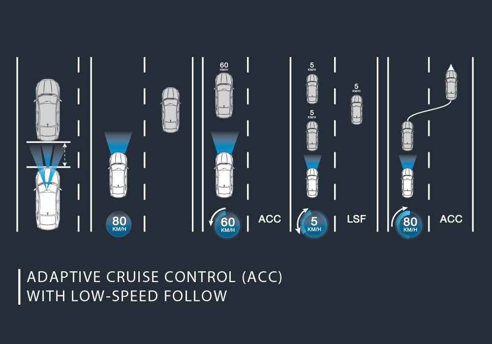 Adaptive Cruise Control (ACC) membantu menjaga kestabilan kecepatan kendaraan dan mengatur jarak di belakang kendaraan yang terdeteksi di depan. Dengan sistem apa pun, ada batasan untuk ACC. Gunakan pedal rem kapan pun jika dibutuhkan dan selalu jaga jarak aman dengan kendaraan lain.