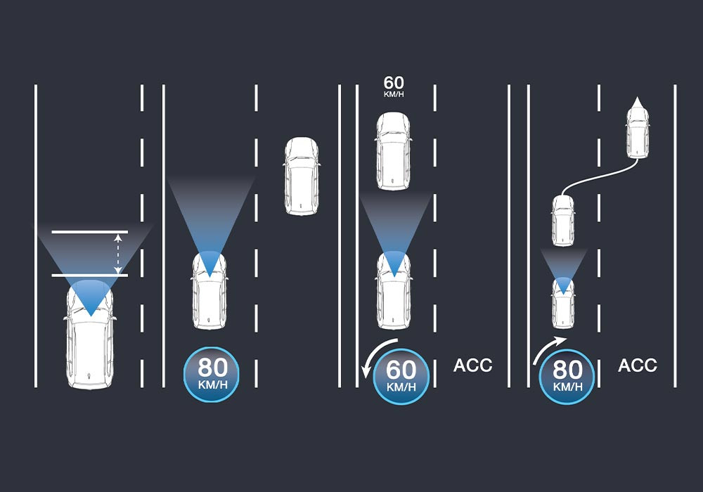 Adaptive Cruise Control (ACC) membantu menjaga kestabilan kecepatan kendaraan dan mengatur jarak di belakang kendaraan yang terdeteksi di depan.