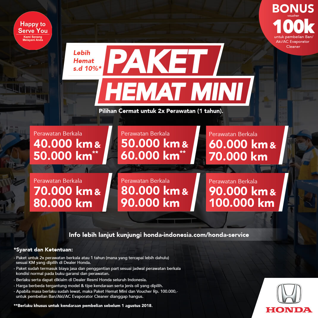 Untuk Anda yang memiliki kendaraan yang sudah memasuki KM diatas 40.000 dan sudah tidak mendapatkan keuntungan gratis biaya jasa, Anda tetap dapat menikmati service hemat di Dealer Honda melalui pembelian “Paket Hemat Mini” untuk 2x perawatan berkala sesuai KM yang dipilih atau 1 tahun (mana yang tercapai lebih dahulu).
