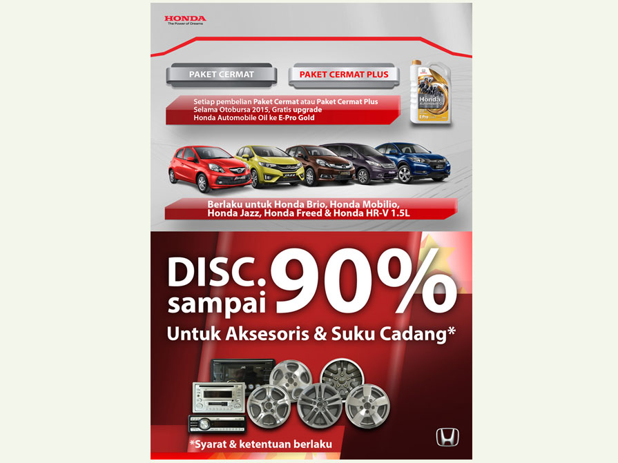 Selain itu Honda juga menawarkan gratis upgrade engine oil ke E-Pro Gold untuk pembelian Paket Cermat dan Paket Cermat Plus berlaku untuk Honda Brio, Honda Mobilio, Honda Jazz, Honda Freed, dan Honda HR-V 1.5 L. Dan dapatkan potongan harga untuk Honda Genuine Parts & Accessories hingga 90%.