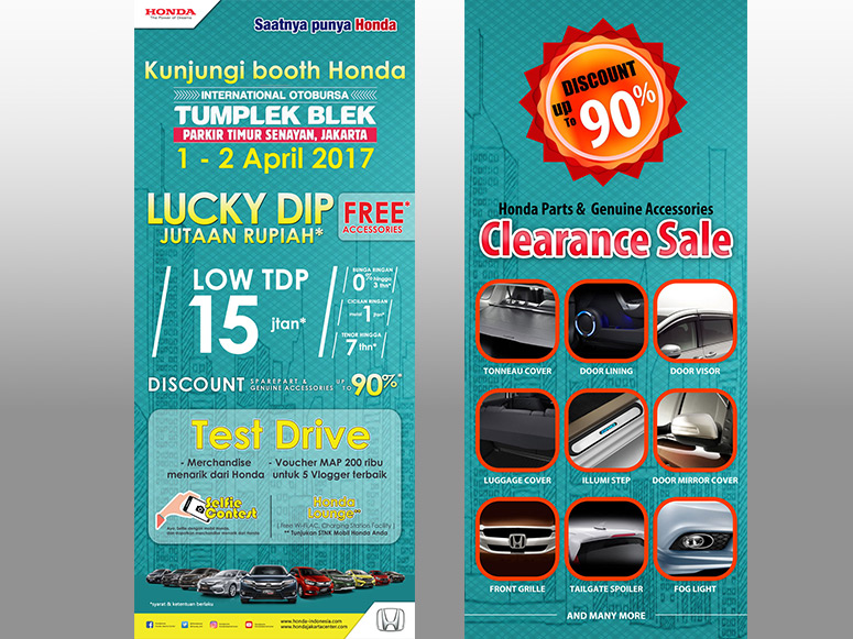 Jakarta, 31 Maret 2017 –  Honda menawarkan program penjuaaln menarik untuk mobil serta diskon suku cadang dan aksesoris asli Honda hingga 90% di ajang Otobursa Tumplek Blek 2017, yang diadakan di Parkir Timur Senayan tanggal 1-2 April 2017. Program penjualan “Saatnya Punya Honda” untuk konsumen yang hadir pada event ini, diantaranya: