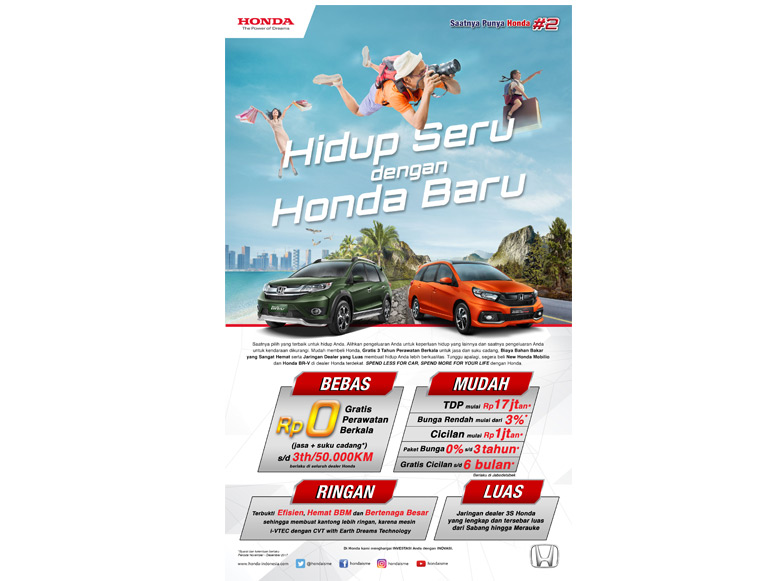 Jonfis Fandy, Marketing & After Sales Service Director PT. Honda Prospect Motor mengatakan, “Kami merancang program yang benar-benar memberikan kemudahan dan keringanan bagi konsumen yang ingin memiliki mobil Honda. Mulai dari berbagai program yang meringankan pembiayaan saat membeli, hingga saat purna jual dimana konsumen tidak perlu lagi memikirkan biaya perawatan berkala selama 3 tahun. Kenyamanan menggunakan New Honda Mobilio dan Honda BR-V tentunya juga didukung oleh mesin yang hemat bahan bakar serta jaringan dealer yang telah tersebar di berbagai wilayah Indonesia.”