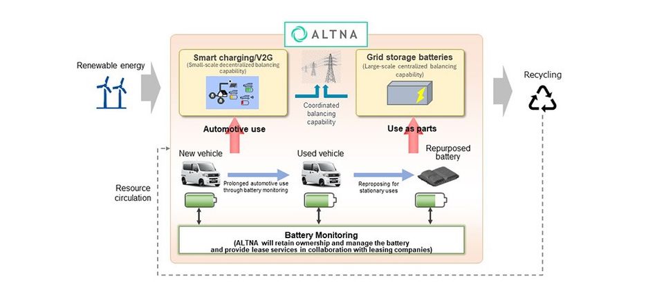 ALTNA juga akan menjalankan pengelolaan bisnis baterai EV yang sudah habis masa pakainya. Hal ini akan memberikan penyesuaian kapasitas pasokan-permintaan untuk memungkinkan stabilitas jaringan yang lebih baik serta berkontribusi terhadap pemanfaatan energi terbarukan secara luas. Kondisi penggunaan baterai akan dipantau dimana baterai yang sudah habis masa pakainya akan didaur ulang.