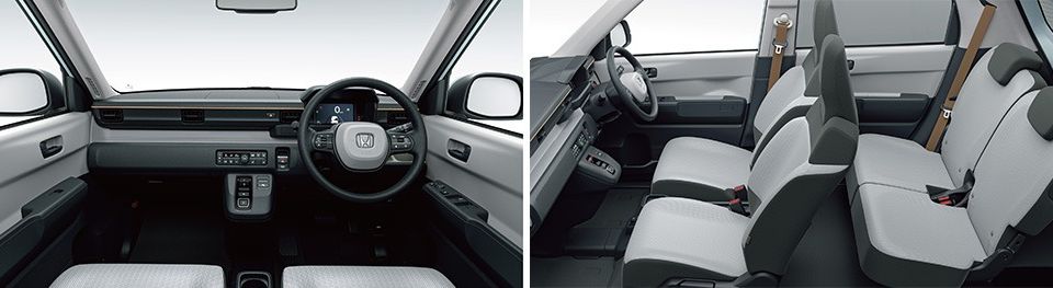Ruang kabin tetap nyaman untuk empat orang dewasa berkat penempatan baterai di bawah lantai. Fleksibilitas khas Honda N-ONE dipertahankan melalui mekanisme dive-down yang memungkinkan kursi belakang dilipat rata sejajar bagasi, serta mekanisme tip-up untuk memuat barang tinggi. Tata letak fleksibel ini memberikan kepraktisan tinggi dalam berbagai situasi.
