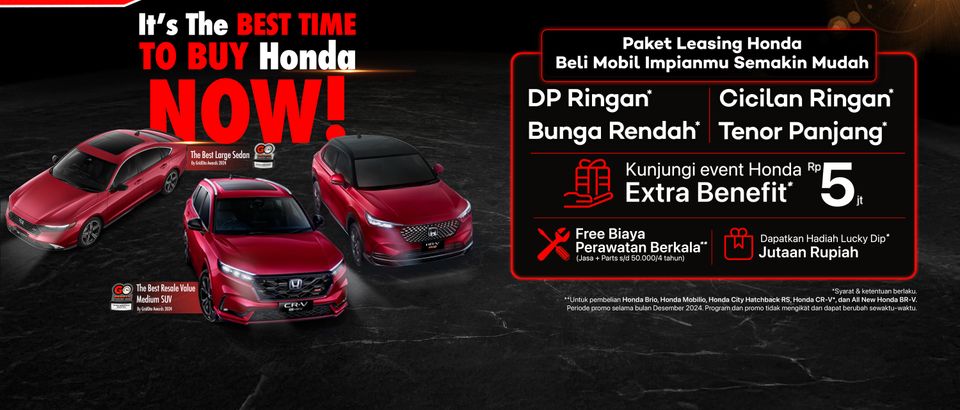Sepanjang Desember 2024, Honda menawarkan berbagai keuntungan melalui program It’s The BEST TIME TO BUY Honda NOW!, mulai dari bebas biaya perawatan hingga 50.000 km atau 4 tahun melalui Paket Hemat 1 untuk pembelian Honda Brio Satya, Honda Brio RS, Honda City Hatchback, Honda CR-V*, hingga All New Honda BR-V. Selain itu, tersedia pula program pembiayaan spesial yang mencakup DP ringan*, cicilan terjangkau*, bunga rendah*, dan tenor panjang*.