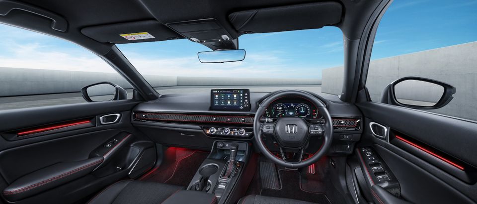 Interior New Honda Civic RS e:HEV dirancang untuk menghadirkan kenyamanan maksimal melalui ruang kabin yang luas, ergonomis, dan berorientasi pada kesenangan berkendara. Di bagian depan, tersedia kursi dengan balutan kombinasi kulit berwarna hitam dengan jahitan merah yang menegaskan karakter sporty khas Civic. Sistem pendingin udara dual zone memungkinkan pengemudi dan penumpang depan mengatur suhu secara terpisah sesuai preferensi.