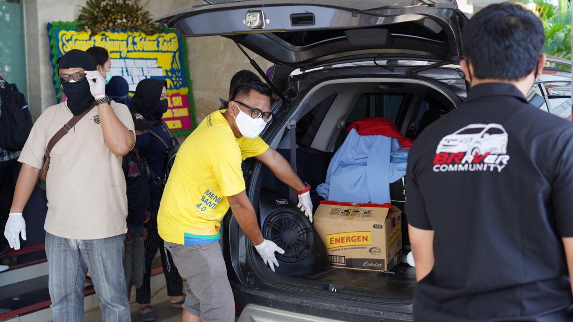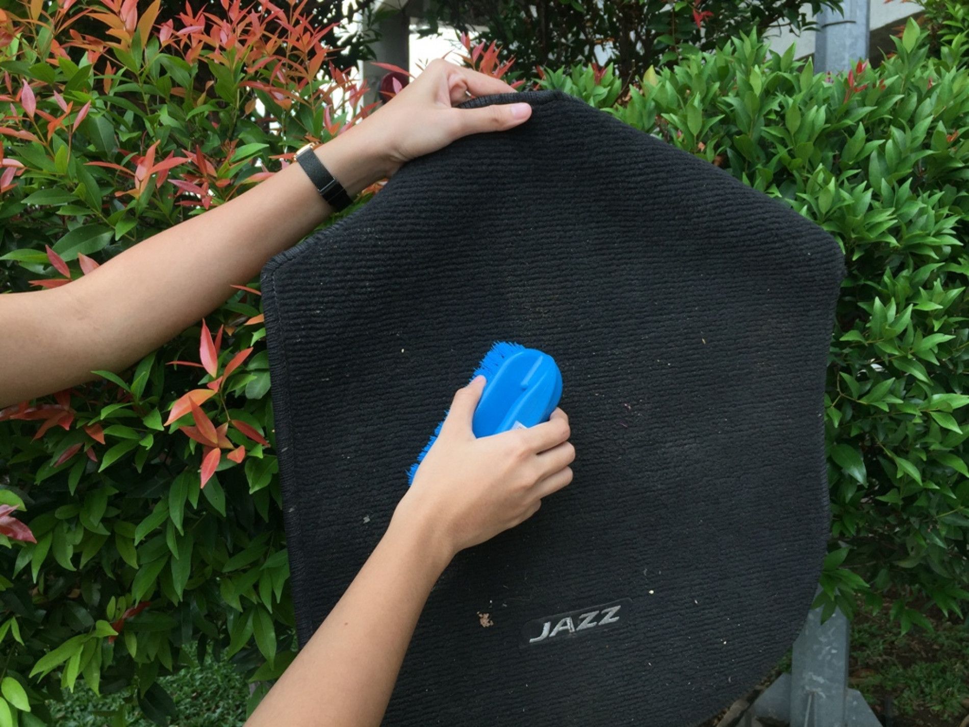 berbahan kain, keluarkan karpet dari mobil kemudian bersihkan dengan sikat