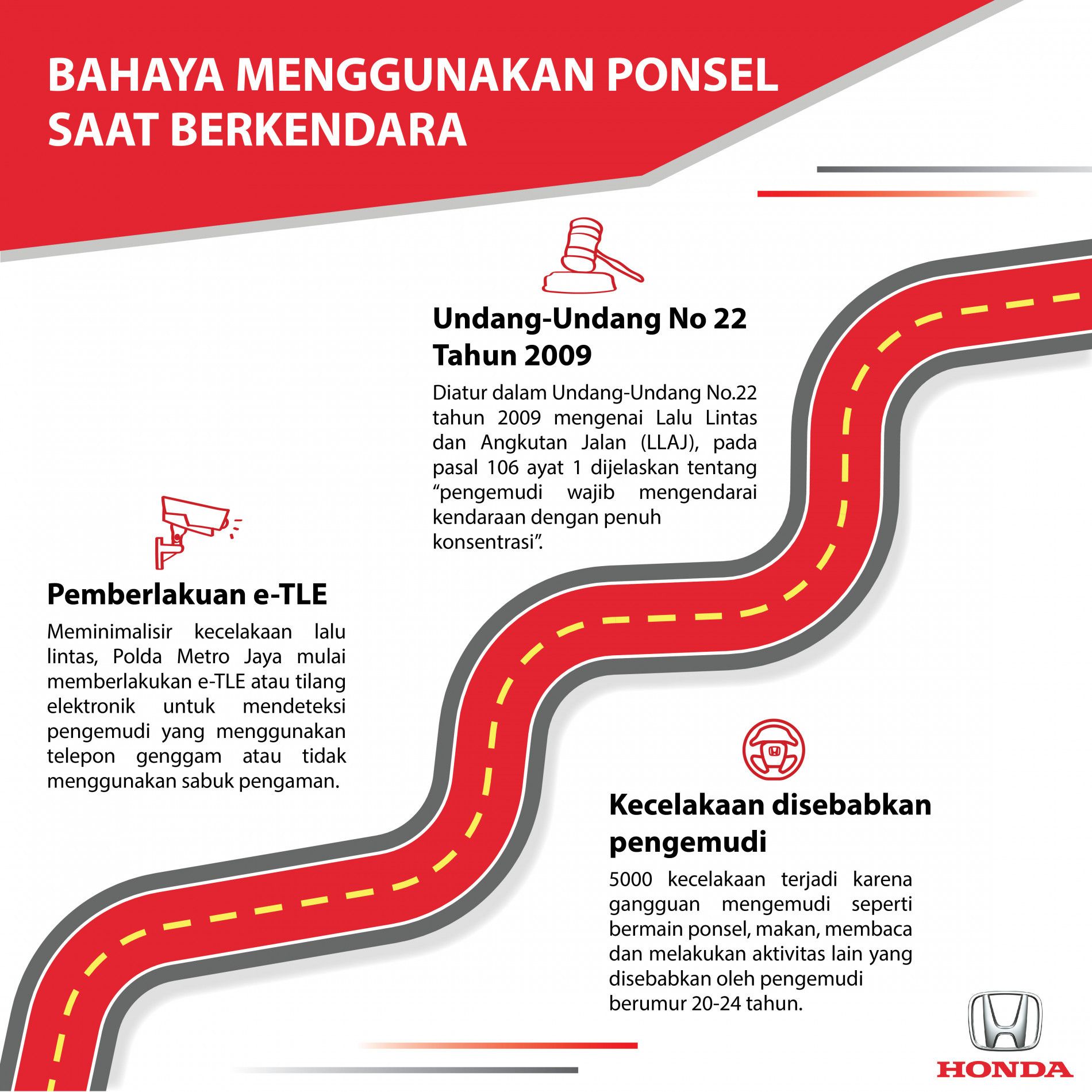 Penggunaan ponsel saat berkendara sebenarnya sudah diatur dalam Undang-Undang No.22 tahun 2009 mengenai Lalu Lintas dan Angkutan Jalan (LLAJ). Pada pasal 106 ayat 1 dijelaskan tentang “pengemudi wajib mengendarai kendaraan dengan penuh konsentrasi”.