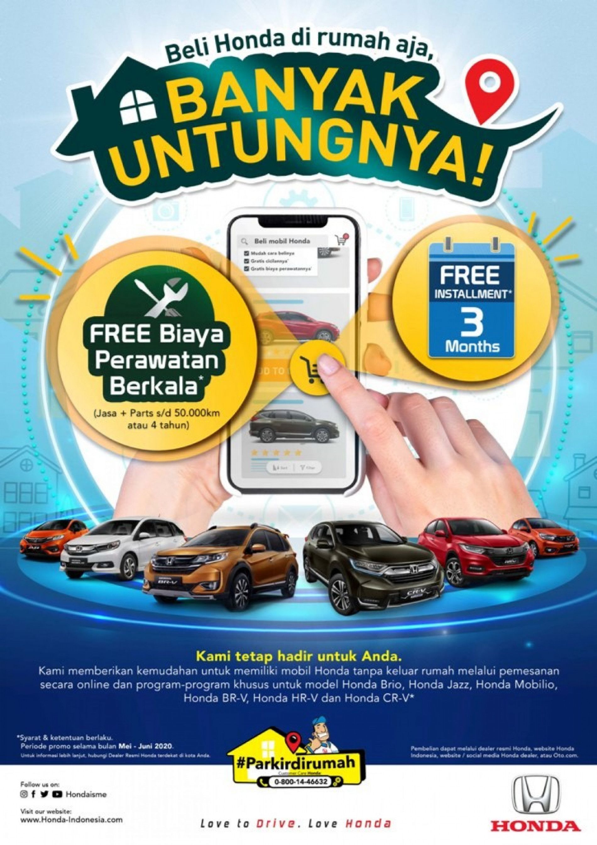 Sejalan dengan tren tersebut, Honda menawarkan program “Beli Honda di Rumah Aja” yang memberikan keuntungan lebih bagi konsumen yang melakukan pembelian melalui situs honda-indonesia.com, situs resmi dealer, dan berbagai jalur online lainnya. Untuk setiap pembelian Honda Mobilio dan Honda BR-V yang dilakukan secara online, konsumen akan mendapatkan gratis cicilan sebanyak 3 bulan. Tidak hanya itu, konsumen juga akan mendapatkan bonus berupa gratis biaya perawatan berkala (Jasa + parts s/d 50.000 km atau 4 tahun) khusus untuk pembelian Honda Mobilio,