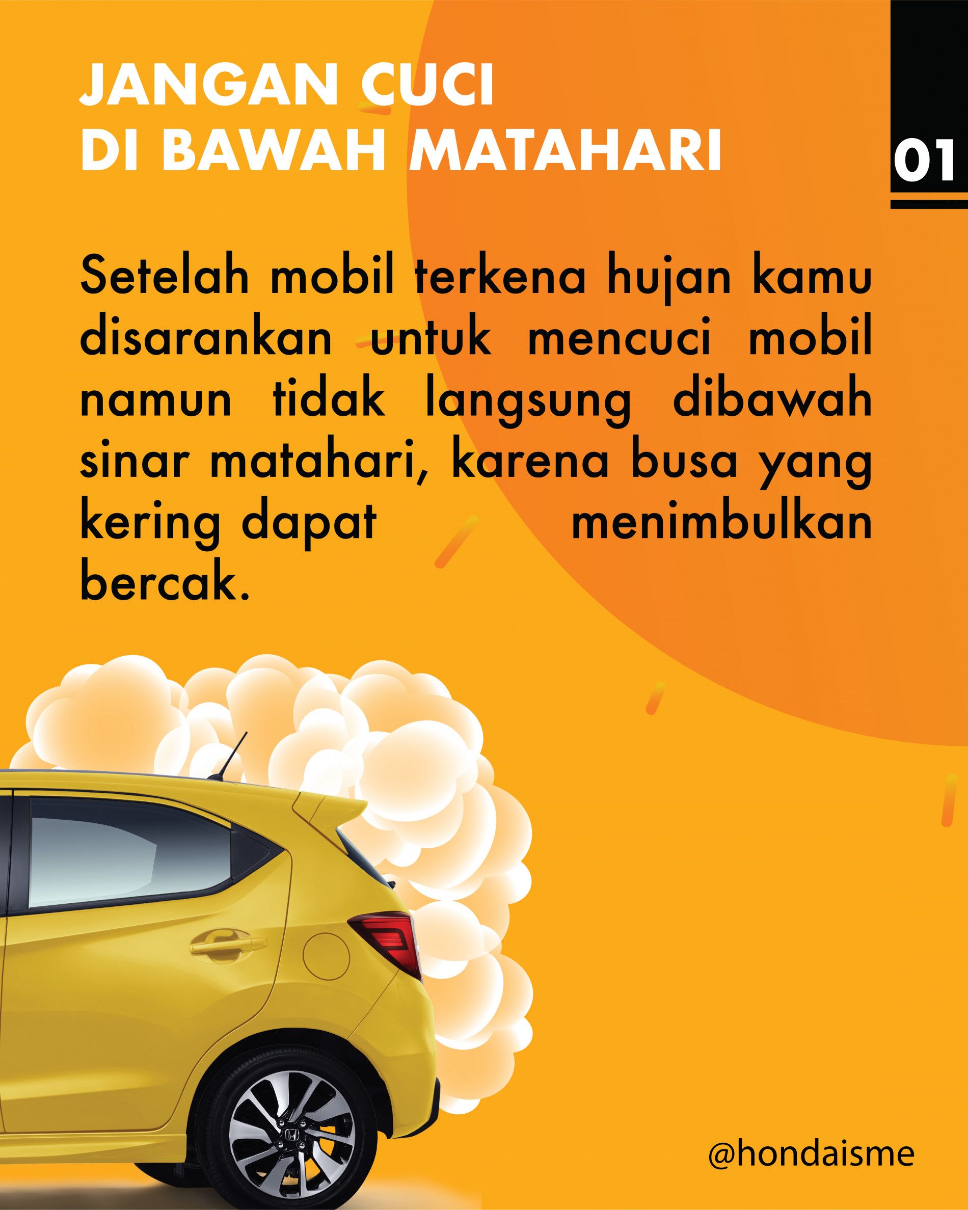 Bila dirasa mobil terkena hujan hampir setiap hari dan tidak memungkinkan untuk langsung mencucinya, kalian dapat membilas mobil menggunakan air bersih dengan memastikan kotoran yang menempel hilang, lalu lap mobil hingga kering. Kemudian di lain waktu, kalian harus tetap mencuci mobil yang sudah dibilas agar warna mobil Honda kalian tahan lama.