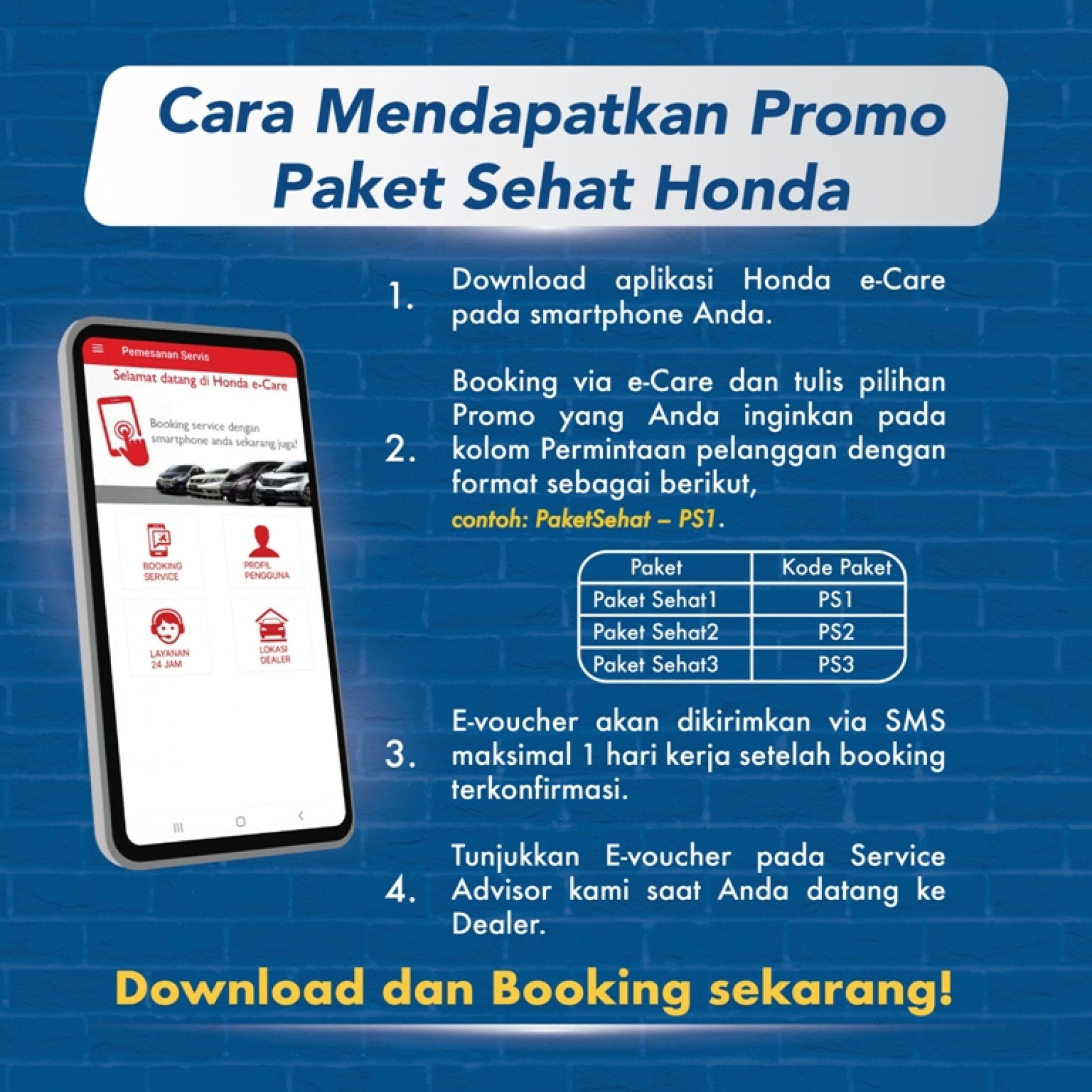 Melengkapi berbagai program yang sedang berjalan saat ini, Honda mengusung program “Sehat Bersama Honda”, yaitu promo bagi konsumen untuk mendapatkan paket harga perawatan mobil terbaik. Dalam program ini, konsumen dapat memilih beberapa paket yang disediakan yang diantaranya adalah Paket Sehat 1 dimana konsumen akan mendapatkan AC filter beserta dengan AC evaporator cleaner dengan harga mulai dari Rp335.000. Untuk Paket Sehat 2, konsumen akan mendapatkan penggantian aki beserta pembersih mesin dari harga Rp760.000. Untuk Paket Sehat 3, konsumen akan mendapatkan penggantian oli, filter oli, washer drain beserta Brake Grease dan gratis perawatan berkala dimulai dari Rp. 685.000. Program ini berlangsung hingga 30 November 2020 bagi konsumen yang telah melakukan booking service pada aplikasi E-care yang dapat diunduh di Playstore.